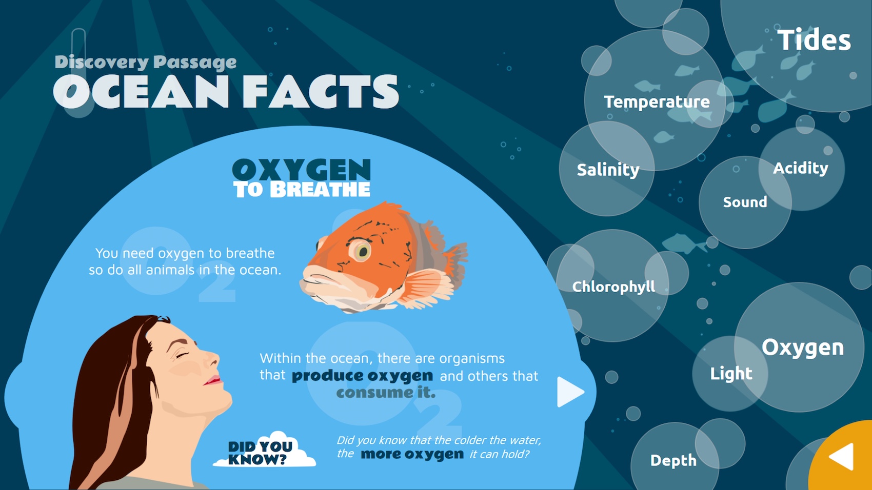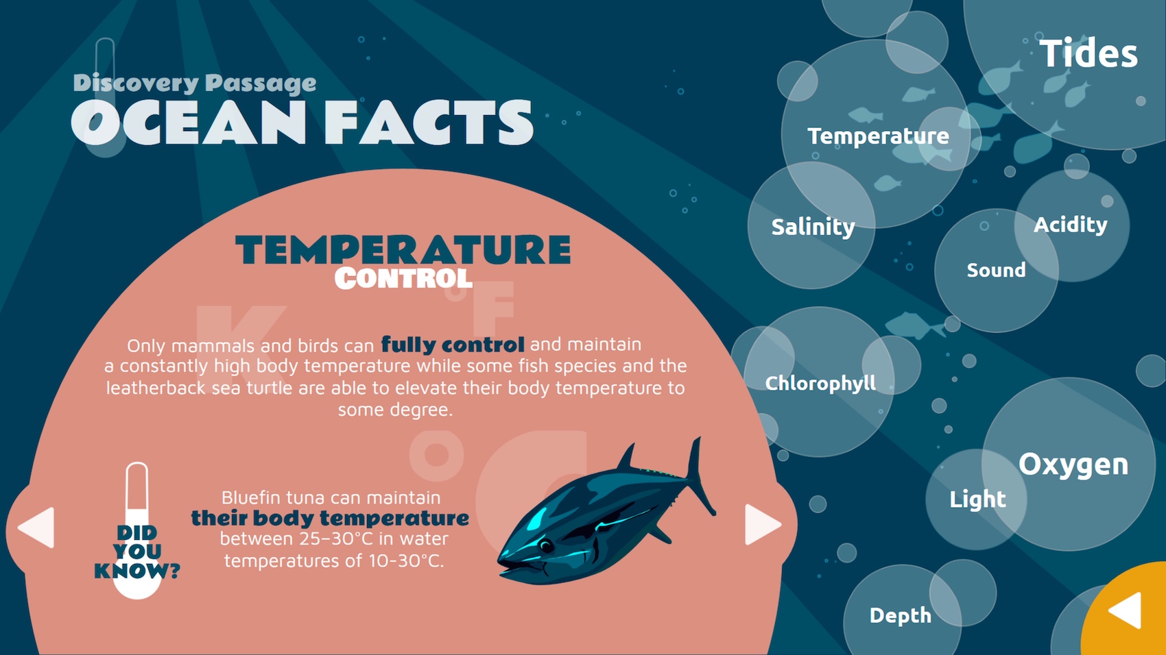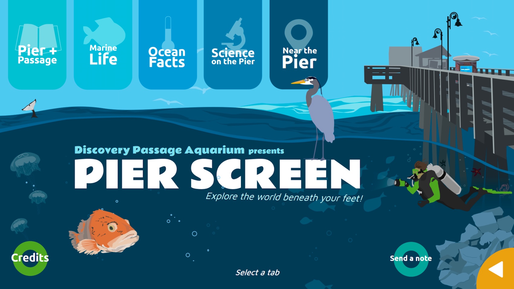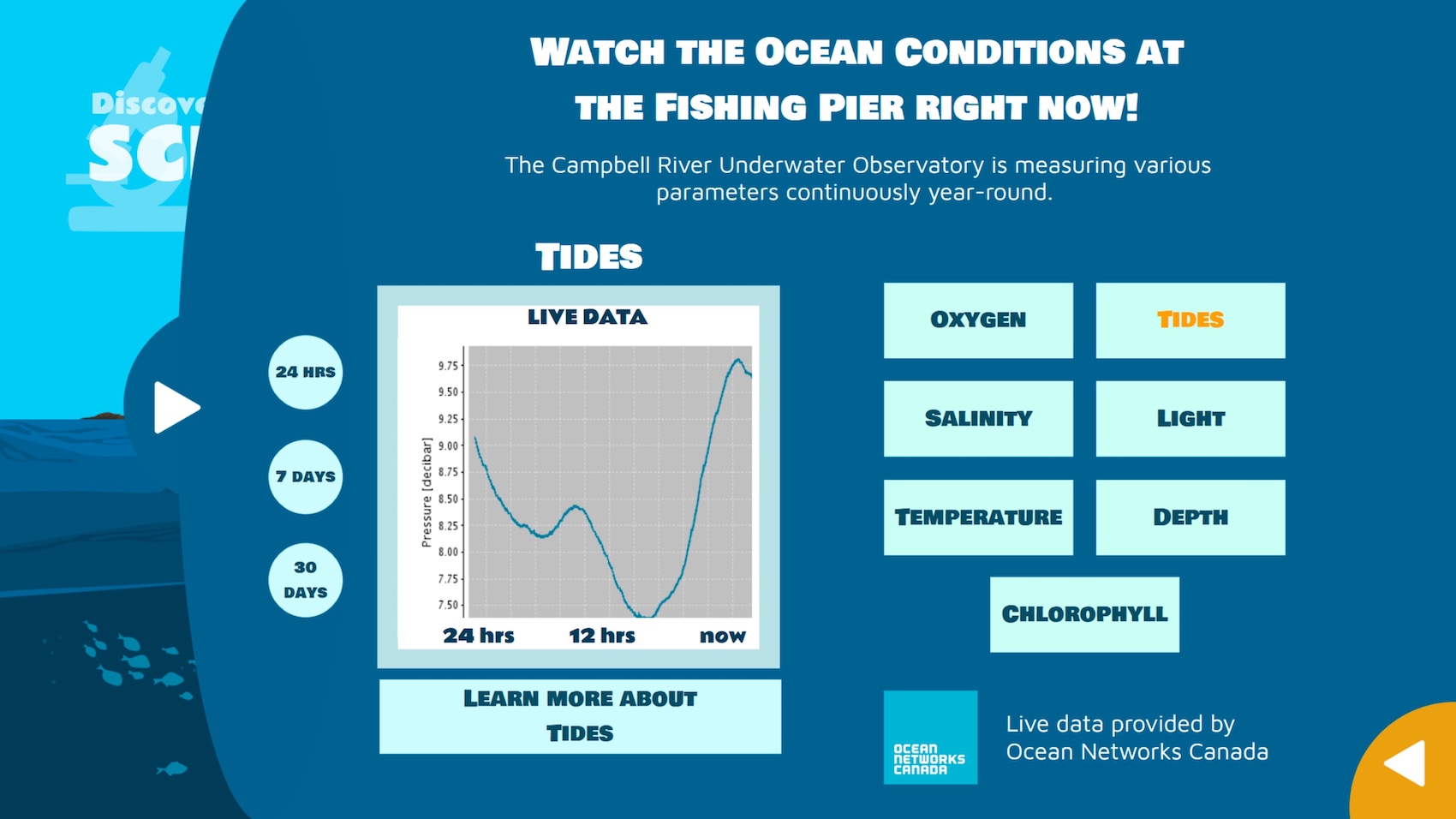 Stories and information are presented through short video documentaries, images, interactive graphics, text and animations and wildlife guides. An online data connection displays live oceanographic measurements collected by the underwater observatory installed below the Pier that is run by Ocean Network Canada.
